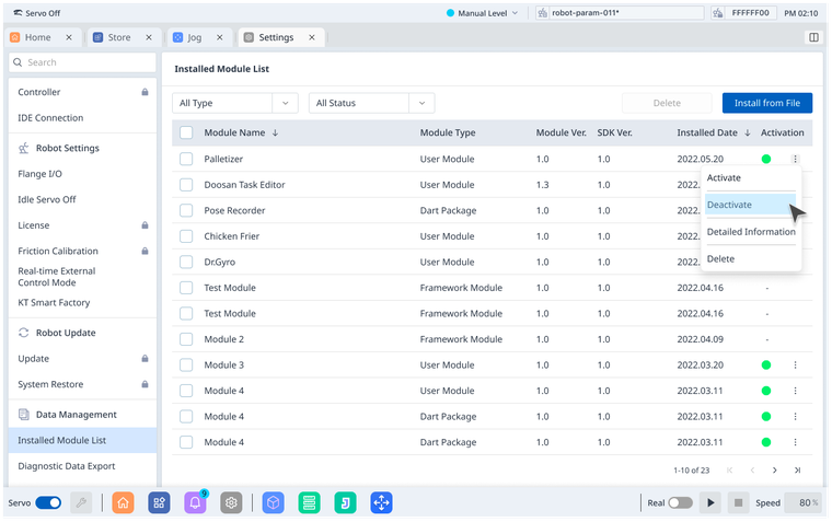 Installed Module liston the left menu ▸ Choose the Module you want ▸ Click on⋮the button ▸ ChooseDeactivateoption.