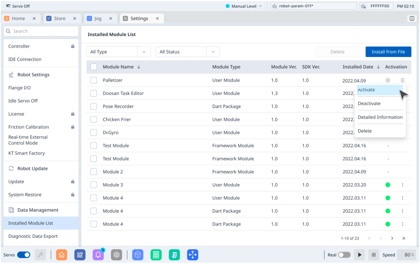 Installed Module liston the left menu ▸ Choose the Module you want ▸ Click on⋮the button ▸ ChooseActivateoption.