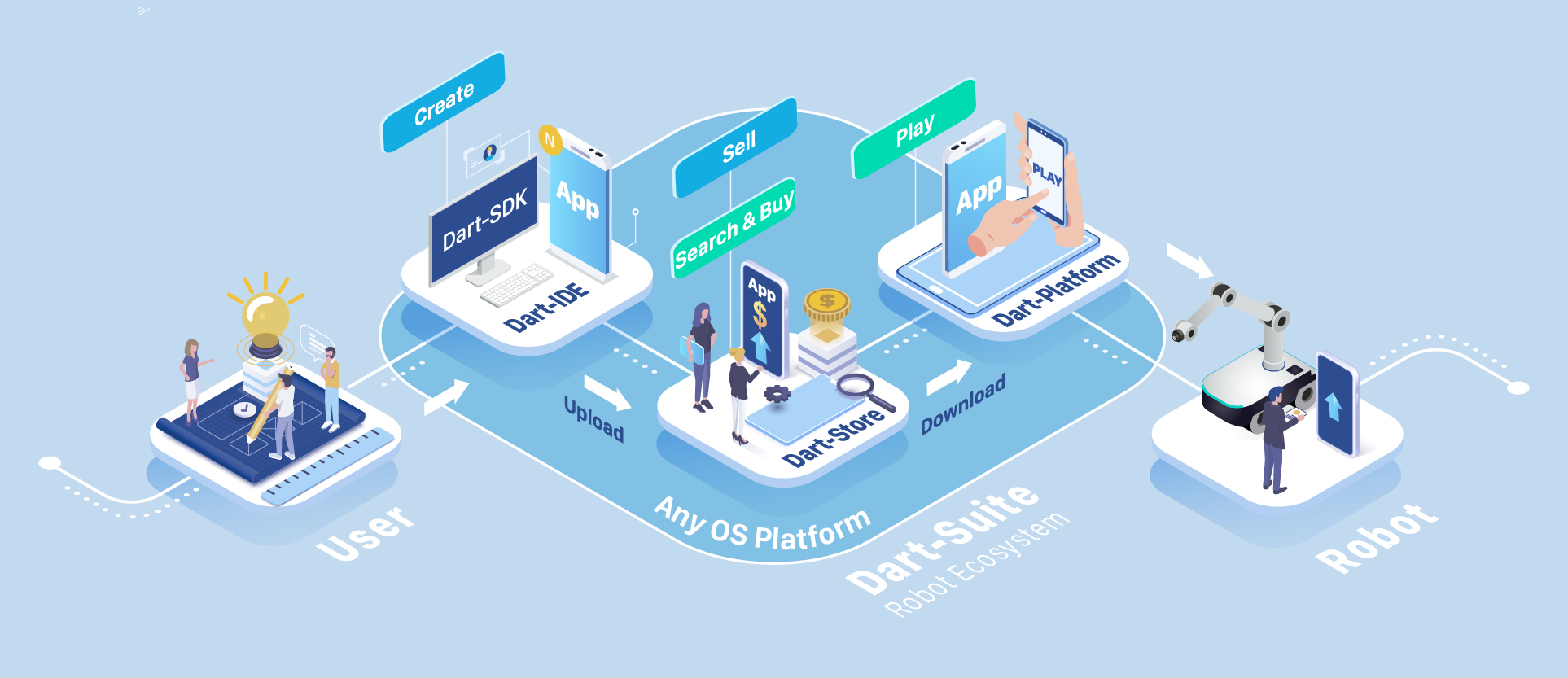 An online store where users can upload and download free or paid robot modules. Additionally, Dart-Store provides a place for advertising and promotion. | A software for running modules created in Dart-IDE that works across various different OS environments. It can control the robot and even create modules using AI. |