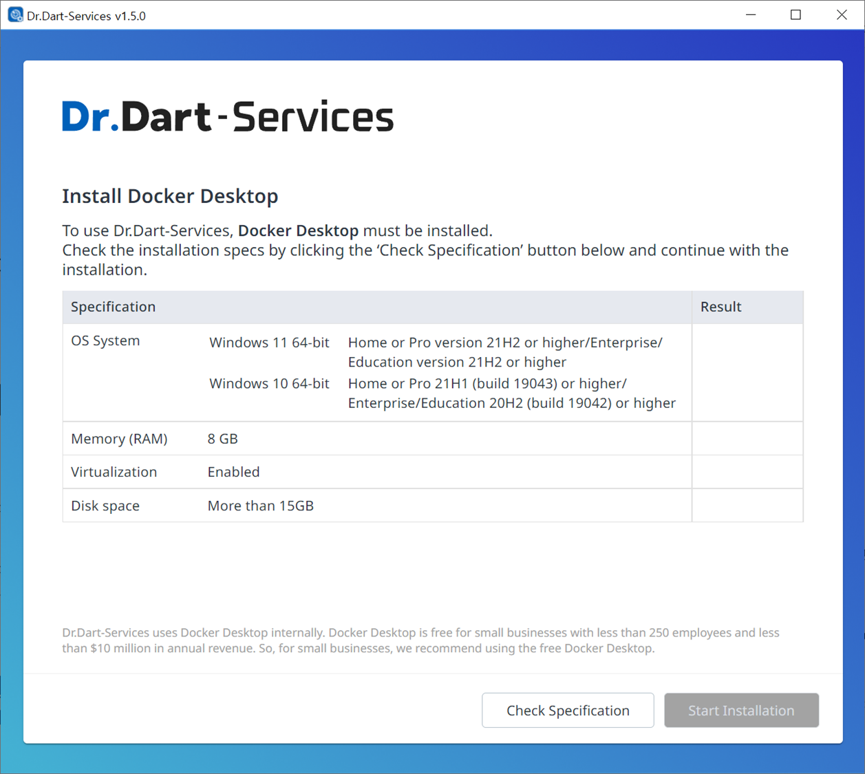 Check Specificationbutton, it will automatically search the PC's environment and set up the Docker environment. Also, it chooses Disk Space C as default folder to save.