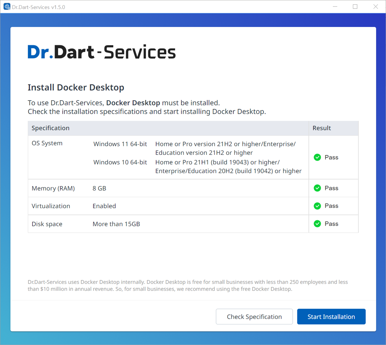 Dart-Services uses the Docker Desktop internally. The Docker Desktop is for Free Only to Small Companies (fewer than 250 employees and less than $10 million in annual revenue). Free Docker is a better option if your company is bigger. Instead of this Docker desktop, you can use this: