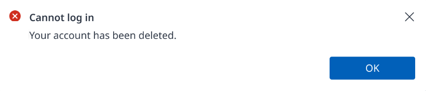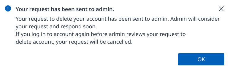 After 10 days since the admin approved the request to delete the account when you log in with the deleted account, the screen will show the following popup.